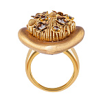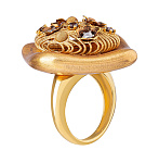 Золотое кольцо - результат слияния безграничной фантазии дизайнера и безупречного мастерства исполнения. Скульптурная форма изделия украшена фианитами разных оттенков.Характеристики:
